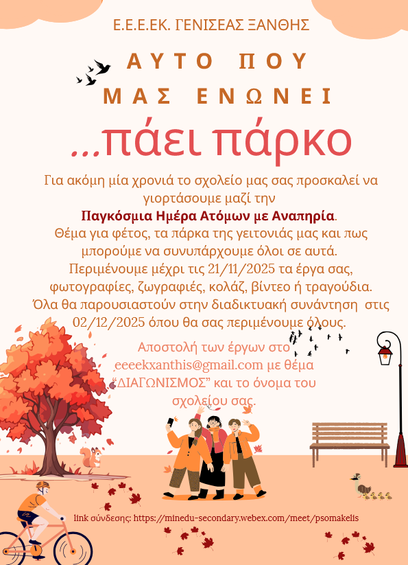 | Περιγραφή | Δημιουργία ζωγραφιάς, κολάζ, βίντεο κτλ. για την Παγκόσμια Ημέρα Ατόμων με αναπηρία |