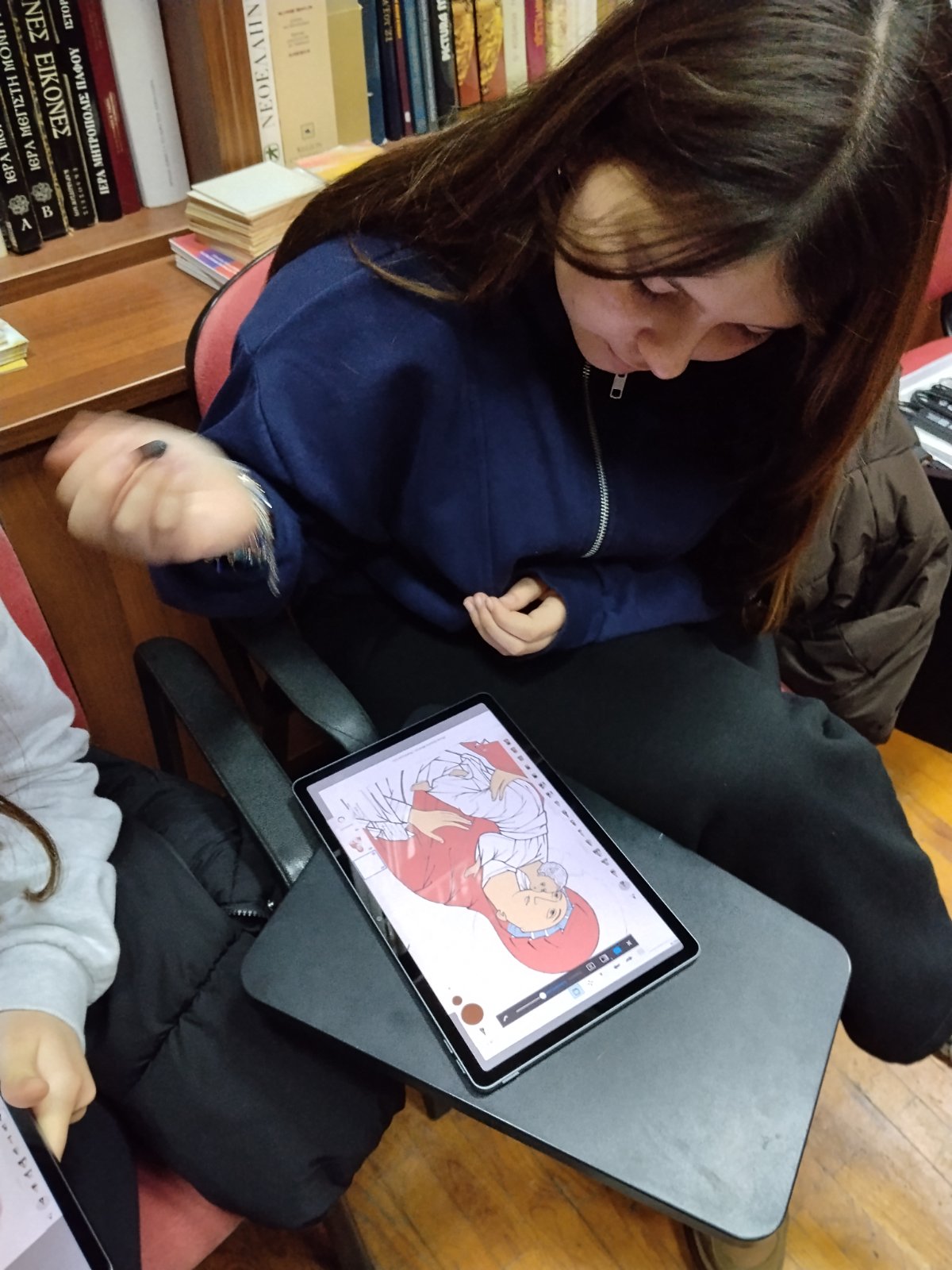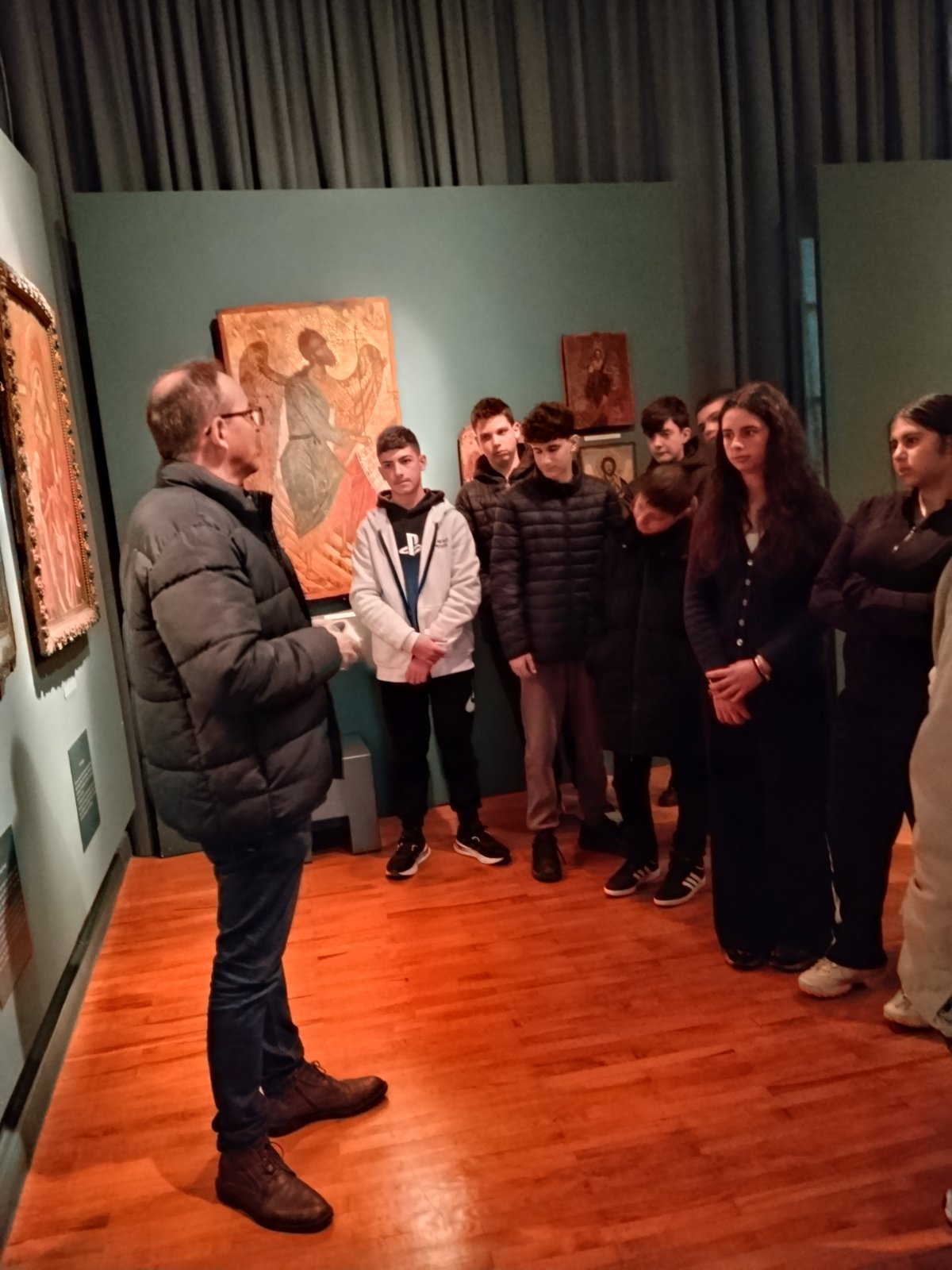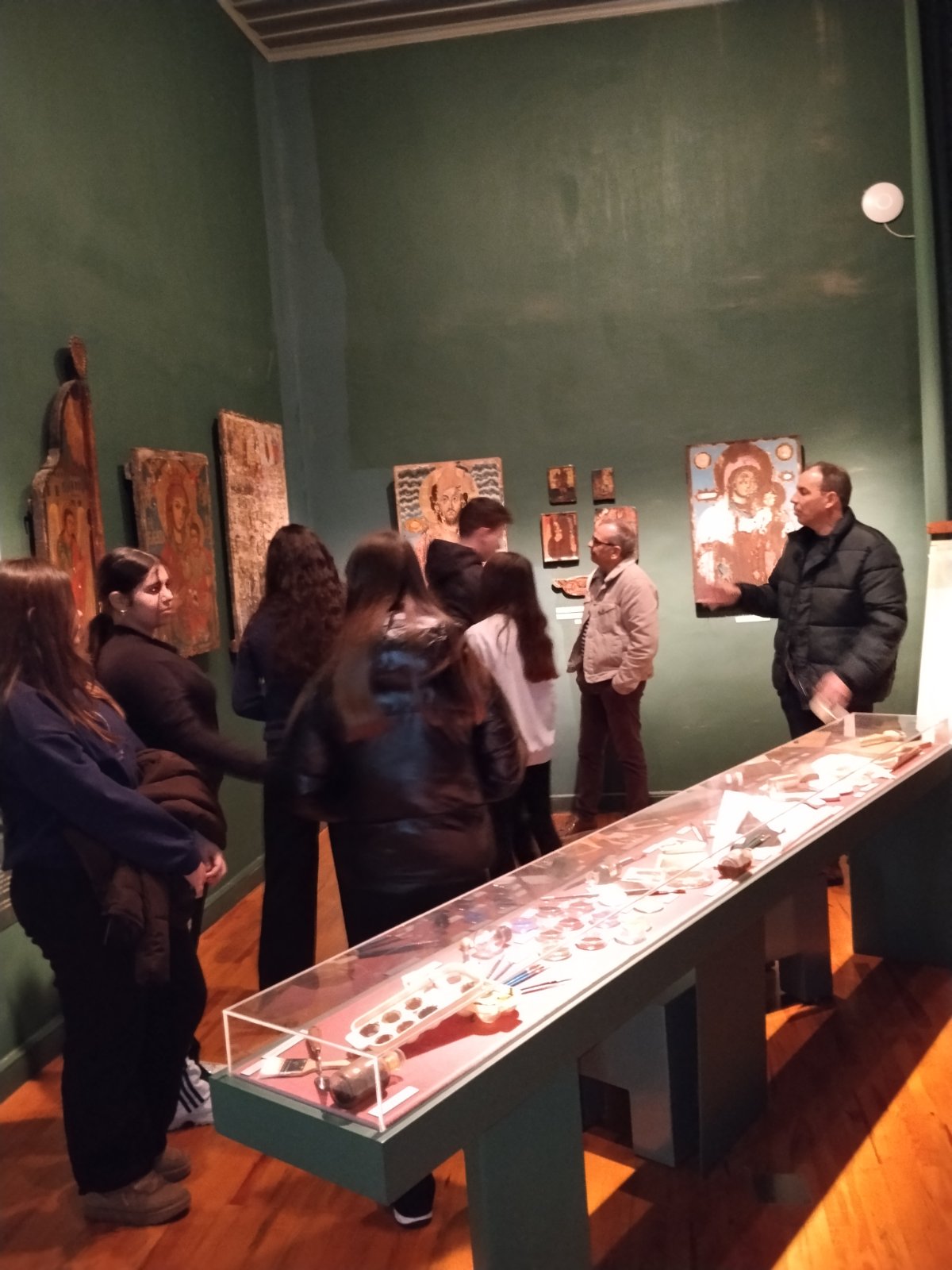 Στο πλαίσιο των μαθημάτων της Βυζαντινής Ιστορίας και των Εικαστικών, το τμήμα Β1 του σχολείου μας επισκέφτηκε το Εκκλησιαστικό Μουσείο Αλεξ/πολης στις 11/2/2026, όπου οι μαθητές συμμετείχαν σε εκπαιδευτικό πρόγραμμα με τίτλο «Από το Ανθίβολο στην Εικόνα», σε μία προσπάθεια να βγουν τα παιδιά από τις σχολικές αίθουσες και να ευαισθητοποιηθούν σε θέματα της πολιτιστικής μας κληρονομιάς. Στόχος του προγράμματος ήταν να μυηθούν οι μαθητές στα μυστικά της μεταβυζαντινής αγιογραφίας, να γνωρίσουν την οργάνωση των εργαστηρίων ζωγραφικής κατά τον 15ο και 16ο αιώνα, τα υλικά και τις τεχνικές, καθώς και το σύνολο των εργασιών για την παραγωγή μιας εικόνας. Στο τέλος, μέσα από μια ειδικά σχεδιασμένη εφαρμογή Αγιογραφίας σε tablet, οι μαθητές μπόρεσαν σε εικονικό περιβάλλον να εξασκηθούν στην Ορθόδοξη ζωγραφική σε όλα τα επίπεδα, από τον σχεδιασμό μιας εικόνας έως και την ολοκλήρωσή της.
