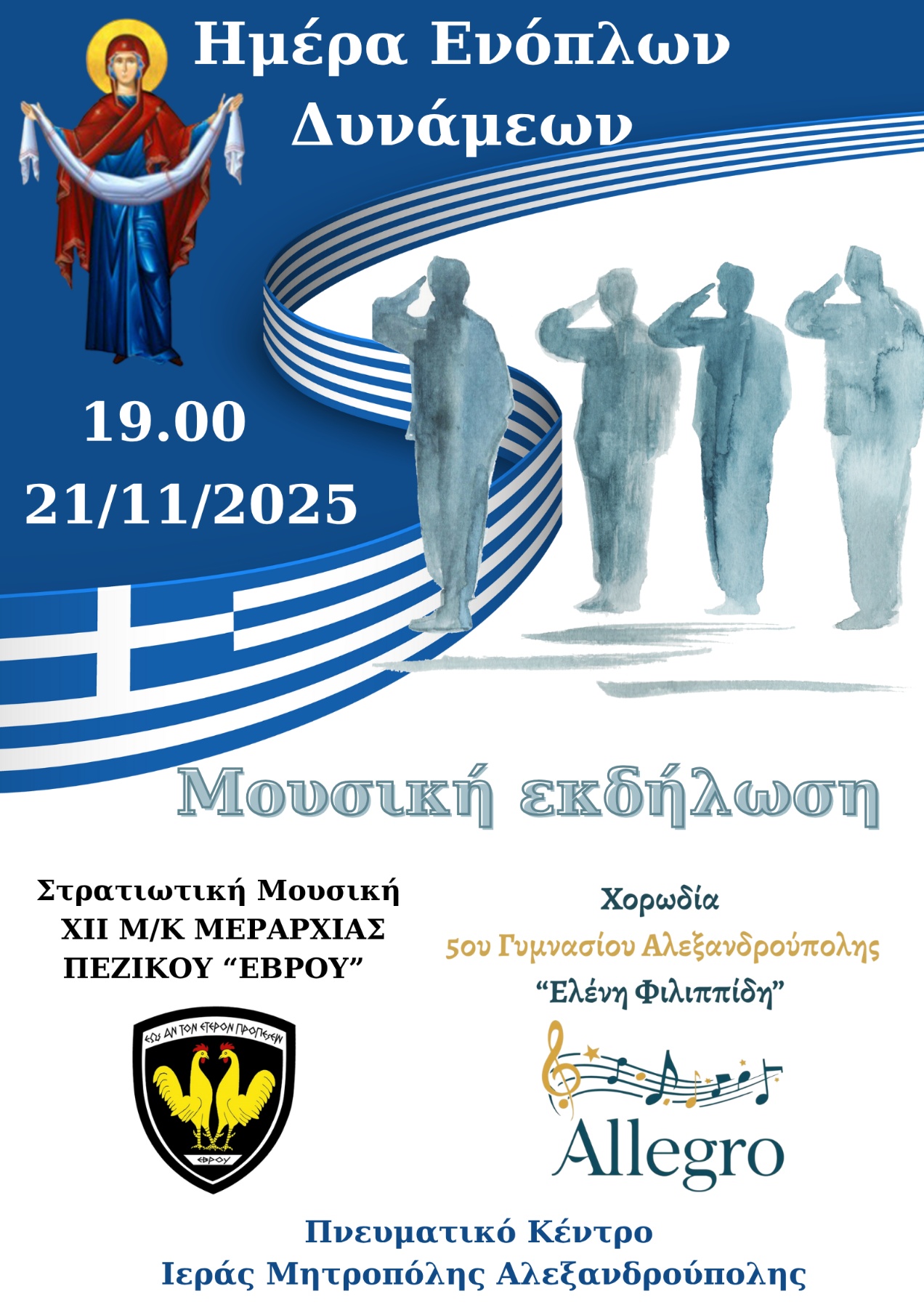 Στις 21 Νοεμβρίου 2025 η χορωδία "Allegro" του 5ου Γυμνασίου Αλεξανδρούπολης "Ελένη Φιλιππίδη", μετά από πρόσκληση της ΧΙΙ ΜΚ Μεραρχίας Πεζικού "Έβρου", θα συμπράξει με τη στρατιωτική μουσική της σε μια εκδήλωση αφιερωμένη στην Ημέρα Εορτασμού των Ενόπλων Δυνάμεων.
