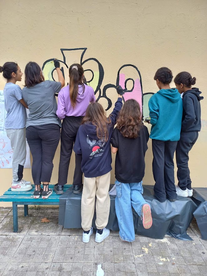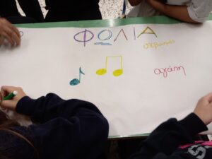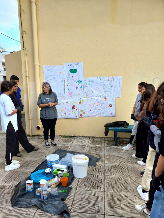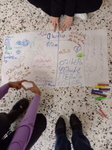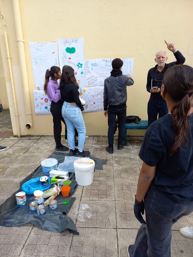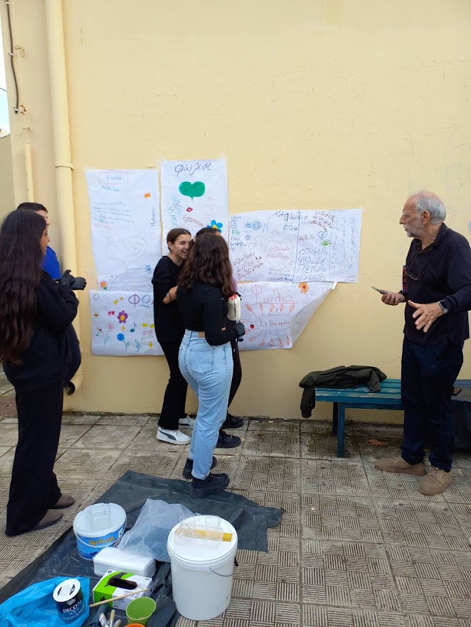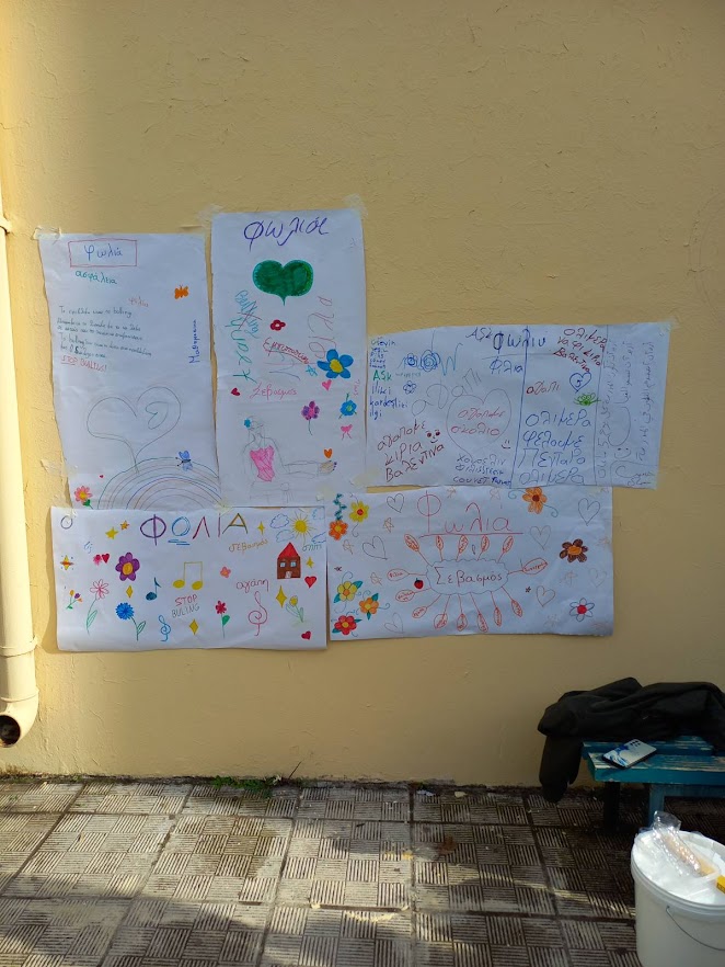 Την Δευτέρα 10 Νοεμβρίου είχαμε την χαρά να φιλοξενήσουμε στο σχολείο μας τον κ. Μόσχο, ο οποίος συμμετείχε σε μια σειρά δραστηριοτήτων με τους μαθητές και τις μαθήτριες. Τα παιδιά με την εμψύχωση της κ. Σωκράτους και του κ. Μόσχου αποτύπωσαν συναισθήματα και σκέψεις σε πανό που δημιούργησαν σε ομάδες, ενώ η ημέρα έκλεισε με την δημιουργία ενός μικρού graffiti στην αυλή του σχολείου – αριστερά της κεντρικής εισόδου – το οποίο συναποφάσισαν να ονομάσουν Φωλιά – ασφαλές μέρος για όλους/ες – το οποίο θα συμβολίζει στο εξής το σημείο όπου μπορεί να καταφεύγει όποιος/α νοιώθει μόνος/η και θέλει να είναι ασφαλής, όπως θα πρέπει να είναι όλα τα παιδιά στο σχολικό πλαίσιο.