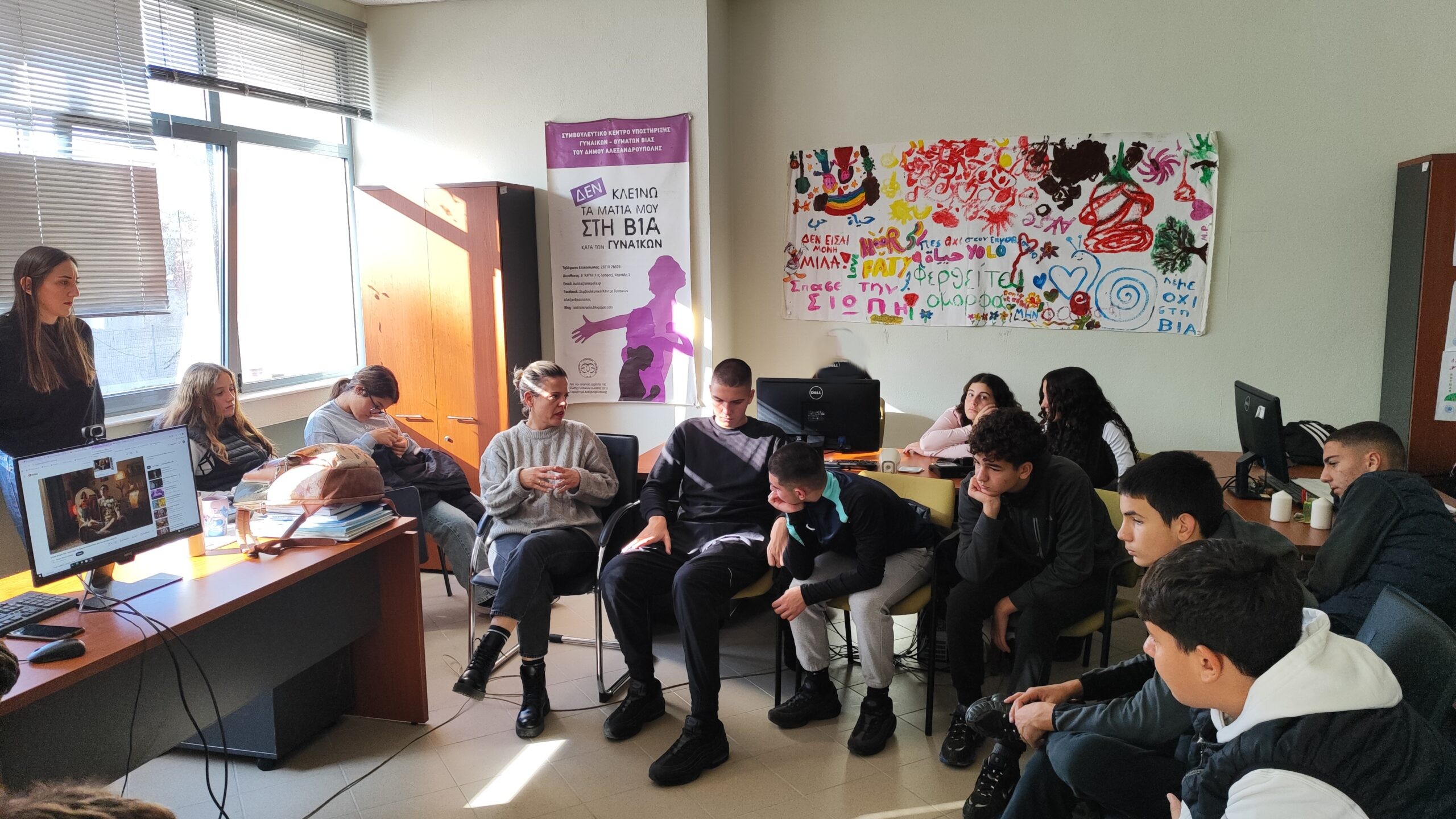 Την Τρίτη 25 Νοεμβρίου, παγκόσμια ημέρα για την εξάλειψη της βίας κατά των γυναικών, στα πλαίσια του μαθήματος Κοινωνικής και Πολιτικής Αγωγής, οι μαθητές του Γ4 τμήματος με τη συνοδεία της εκπαιδευτικού Ιωαννίδου Αιμιλίας, επισκέφθηκαν το Συμβουλευτικό Κέντρο Υποστήριξης Γυναικών -θυμάτων Βίας του Δήμου Αλεξανδρούπολης.