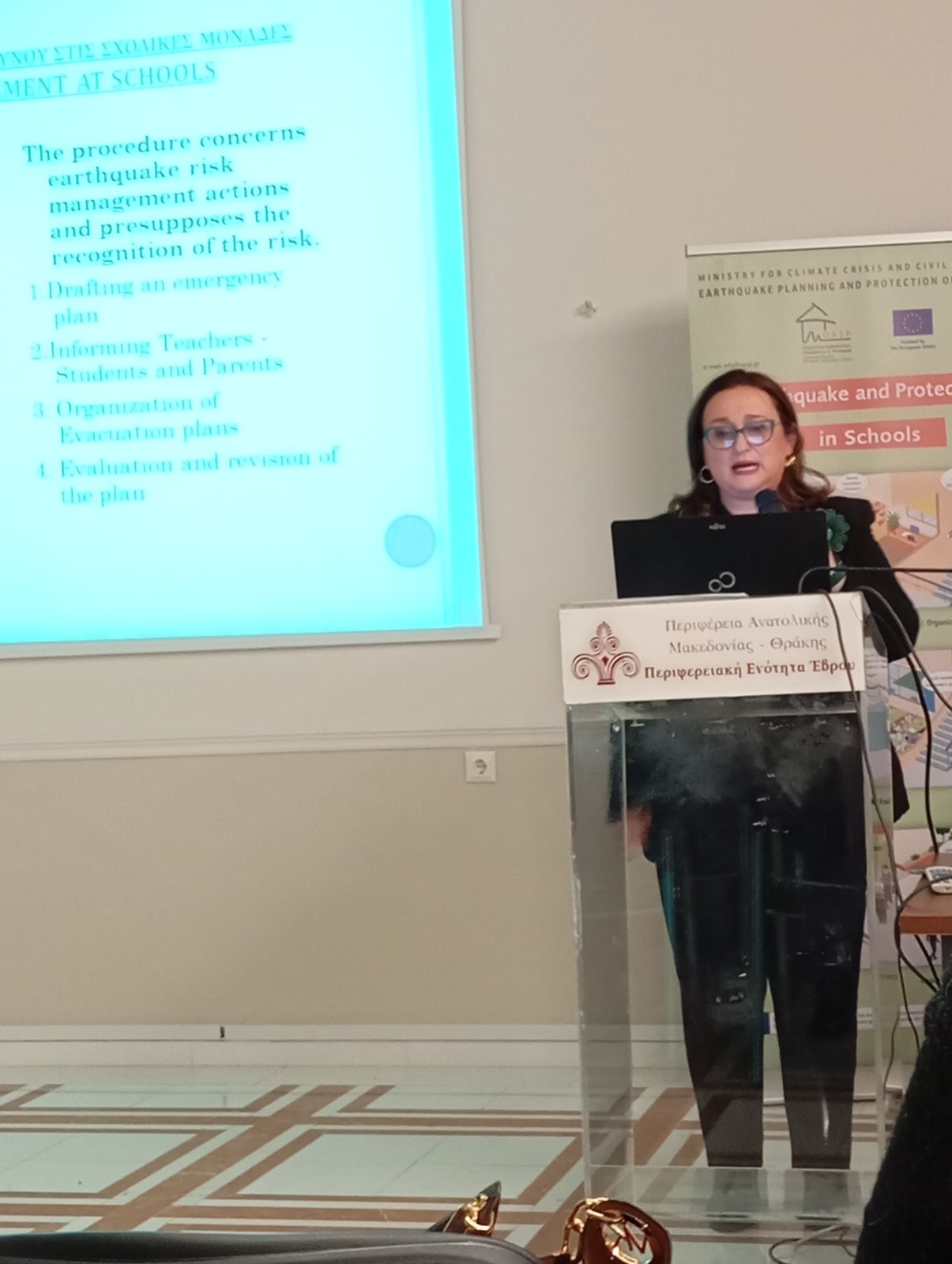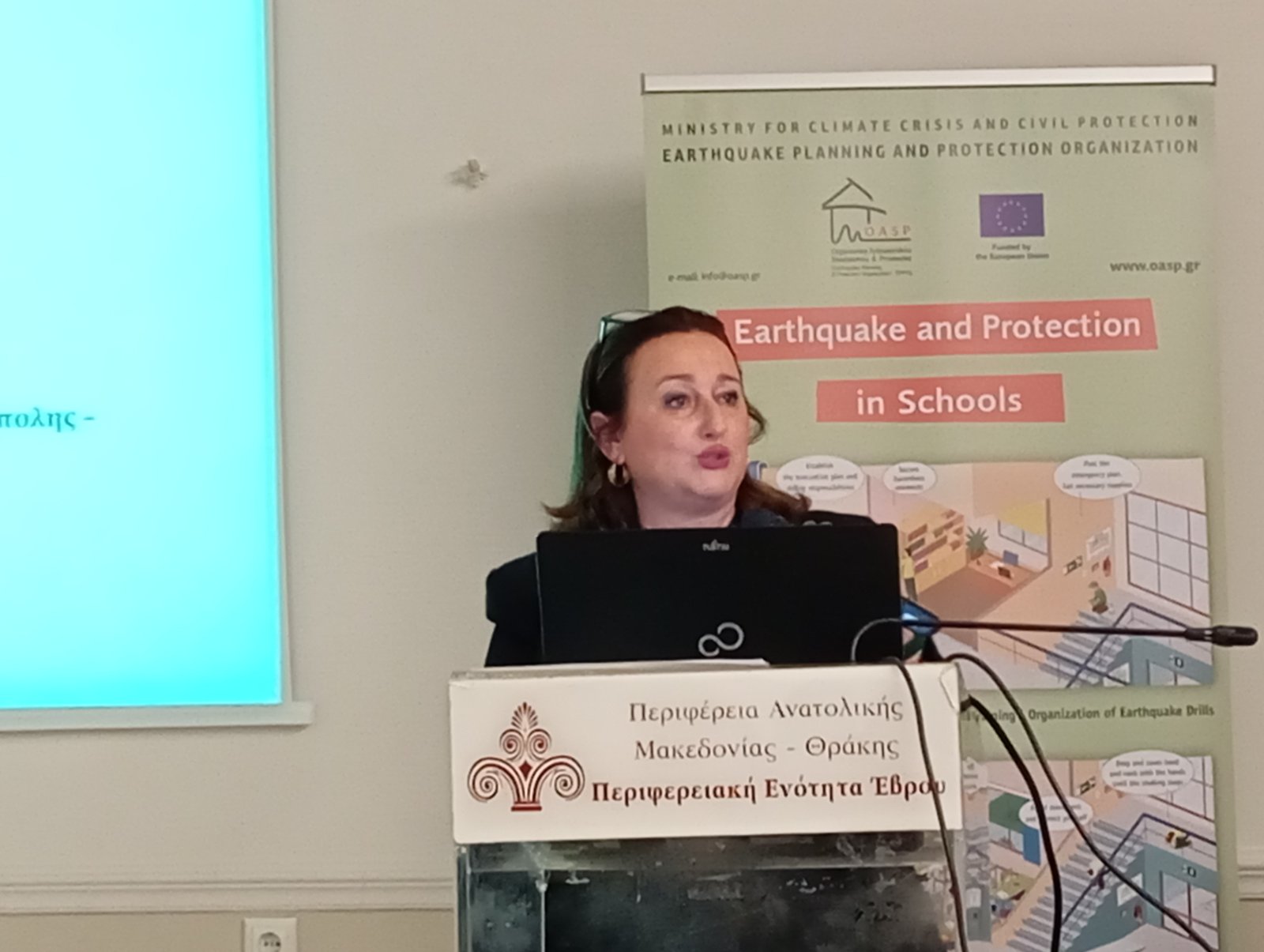 Στην ημερίδα το 5ο Γυμνάσιο Αλεξανδρούπολης – Ελένη Φιλιππίδη εκπροσωπήθηκε από την διευθύντριά μας κ. Μπιλιμπίνη Ε. και τον κ. Λιγούδη Γ. με την κ. Μπιλιμπίνη να έχει ιδιαίτερα ενεργό ρόλο στην ημερίδα καθώς ανέλαβε να παρουσιάσει τις θέσεις, τις προτάσεις αλλά και τους προβληματισμούς των σχολικών μονάδων σε σχέση με την προετοιμασία, την εκπαίδευση αλλά και την ανταπόκριση των σχολικών κοινοτήτων (εκπαιδευτικοί, μαθητές και γονείς/κηδεμόνες) σε ενδεχόμενο σεισμό.