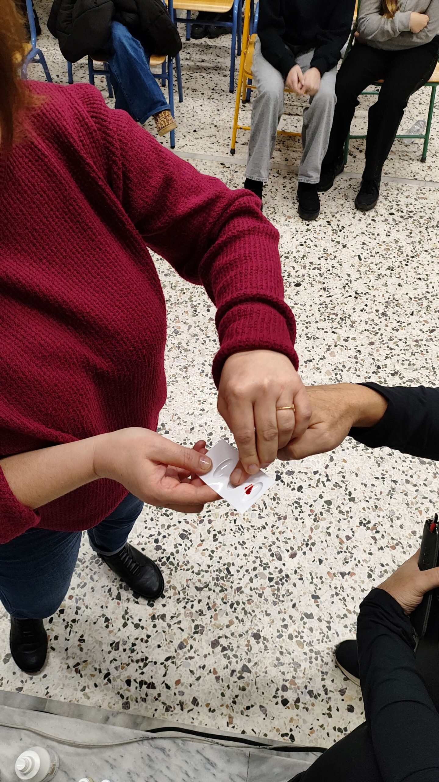 Στο τέλος της εκδήλωσης η κυρία Νανούση βοήθησε όσους μαθητές επιθυμούσαν να μάθουν την ομάδα αίματος τους και μπορούσε να λάβει δείγματα σάλιου από όσους επιθυμούσαν να εγγραφούν στο Μητρώο Εθελοντών Δοτών Μυελού των Οστών, ηλικίας 18–45 ετών.